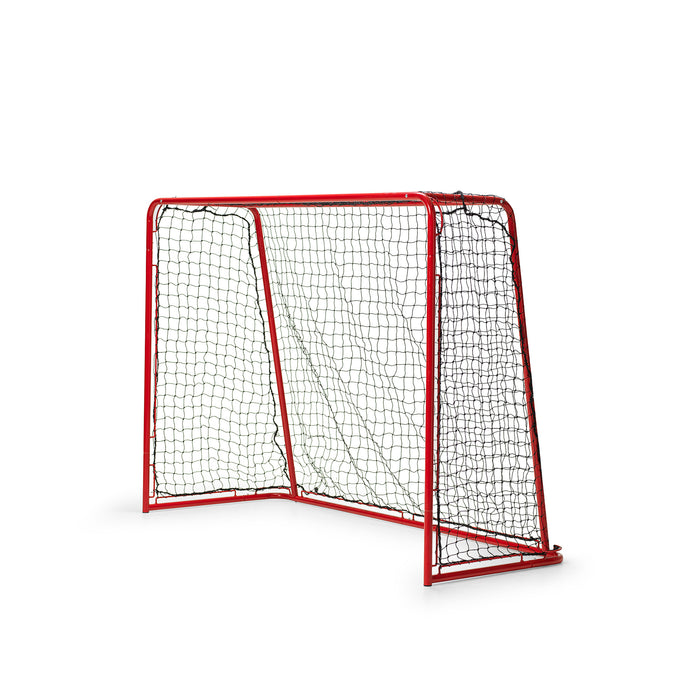 Innebandymål i full officiell storlek. Målburen kommer nermonterad och byggs enkelt ihop med ett smart klicksystem. Klarar att stå ute året om.